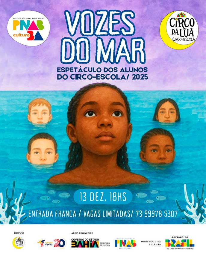 O esperado espetáculo de final de ano, onde os alunos do circo-escola apresentam seus talentos e aprendizados! Mais uma vez, uma despedida de ano com muita arte e alegria! "Vozes do Mar". Dia 13 de dezembro, às 18hs no Circo da Lua. Crianças, adolescentes, jovens, equipe do circo, familiares e apoiadores se unem mais uma vez para que aconteça um lindo espetáculo! Entrada franca. Vagas limitadas.