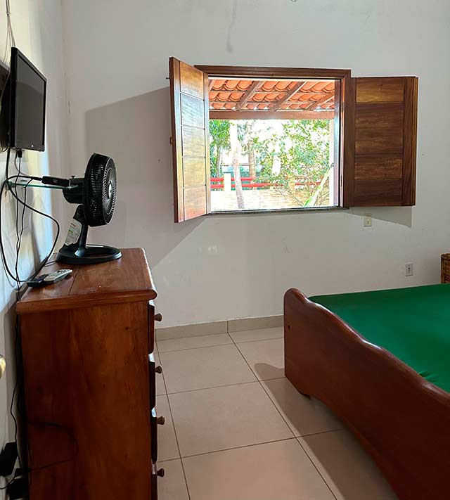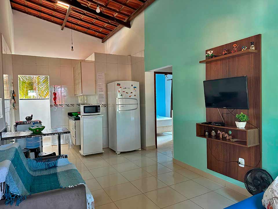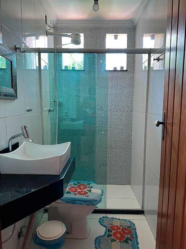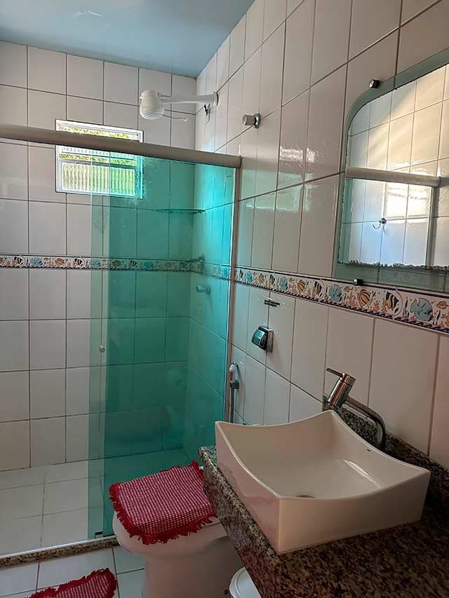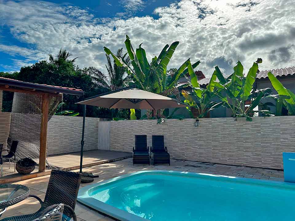 Casa com três quartos sendo uma suíte, banheiro social, sala e cozinha amplas, estacionamento, churrasqueira e ducha. Disponível também um chalé com dois quartos, uma suíte, banheiro social, sala e cozinha. Os quartos possuem varanda. Churrasqueira, piscina e estacionamento.